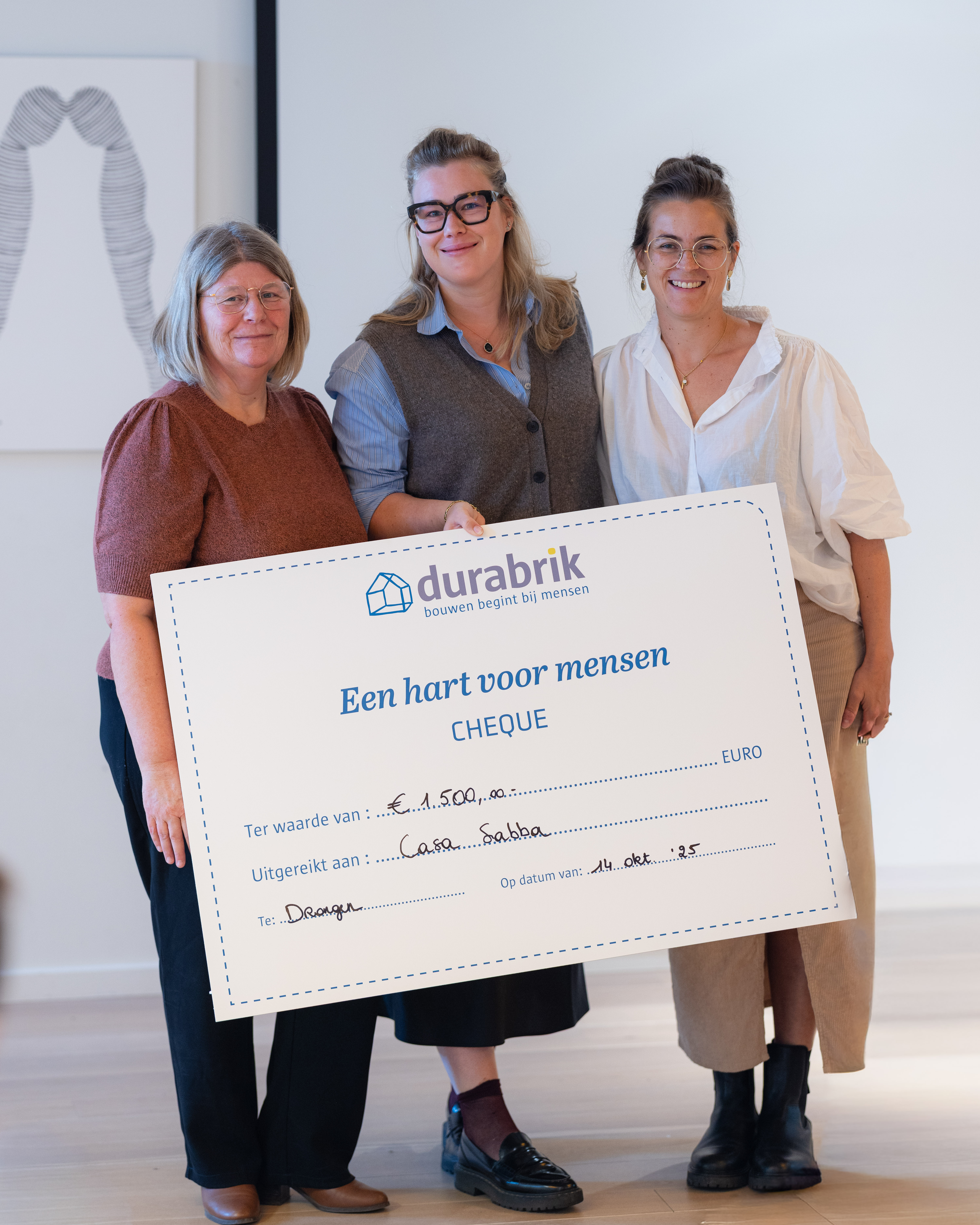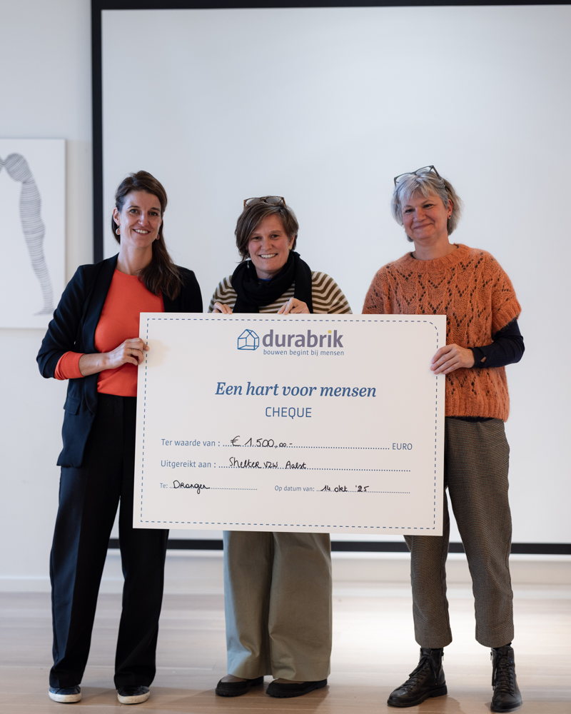 15 oktober 2025 – Al voor de tiende keer geeft bouwbedrijf Durabrik uit Drongen - dochterbedrijf van Camino - bij elk grootschalig nieuwbouwproject een lokaal goed doel een financieel duwtje in de rug. Dit jaar krijgen maar liefst zeven organisaties uit heel Vlaanderen elk 1.500 euro aan steun, goed voor een totaalbedrag van 10.500 euro. De goede doelen, van thuisschoolbegeleiding voor zieke kinderen tot een inloophuis voor psychisch kwetsbare mensen, kregen gisteren de cheque overhandigd. “We kiezen er bewust voor om kleinere goede doelen uit de buurt te steunen, omdat die organisaties het vaak moeilijk hebben om de eindjes aan elkaar te knopen, terwijl ze net heel waardevol werk doen voor de (lokale) gemeenschap,” klinkt het bij Durabrik.