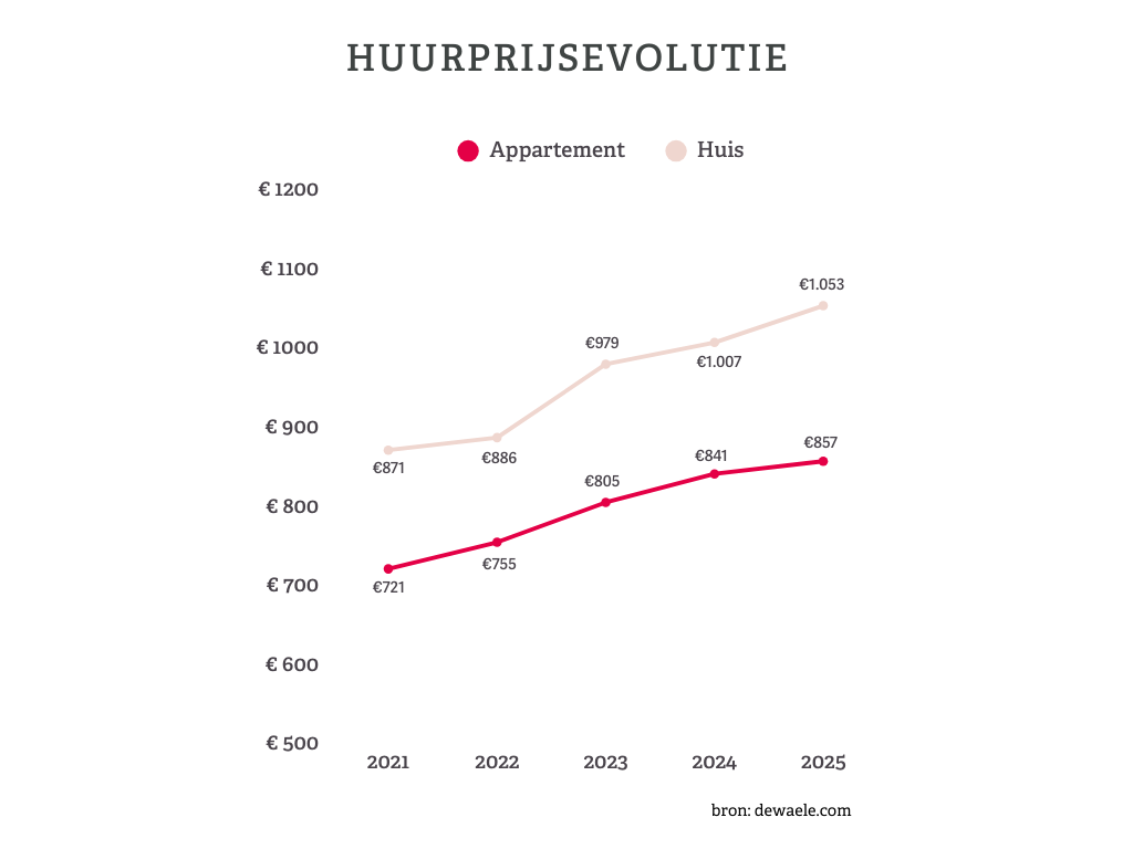 Wie in 2025 een huurcontract voor een eenslaapkamerappartement afsloot, betaalde gemiddeld 753 euro per maand, een stijging van 3,8% tegenover een jaar eerder. De huurprijs van een tweeslaapkamerappartement bedroeg gemiddeld 881 euro, goed voor een beperktere stijging van 2,5%. Daarmee is het prijsverschil tussen beide types teruggevallen tot 'maar' 128 euro.