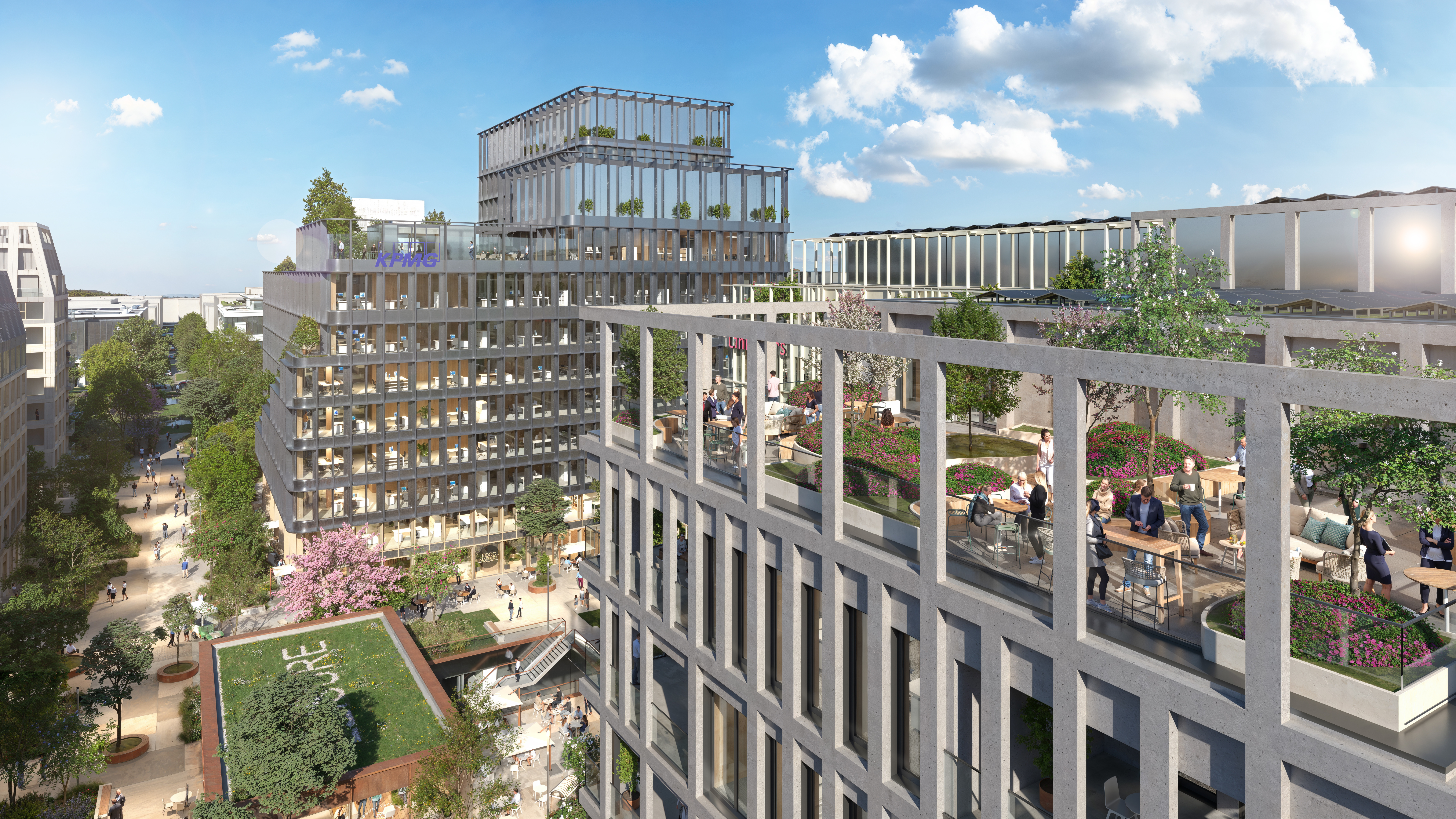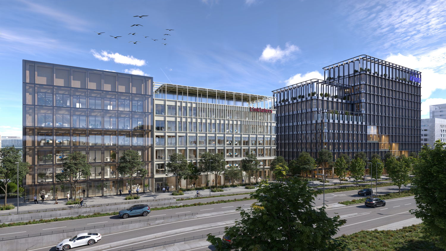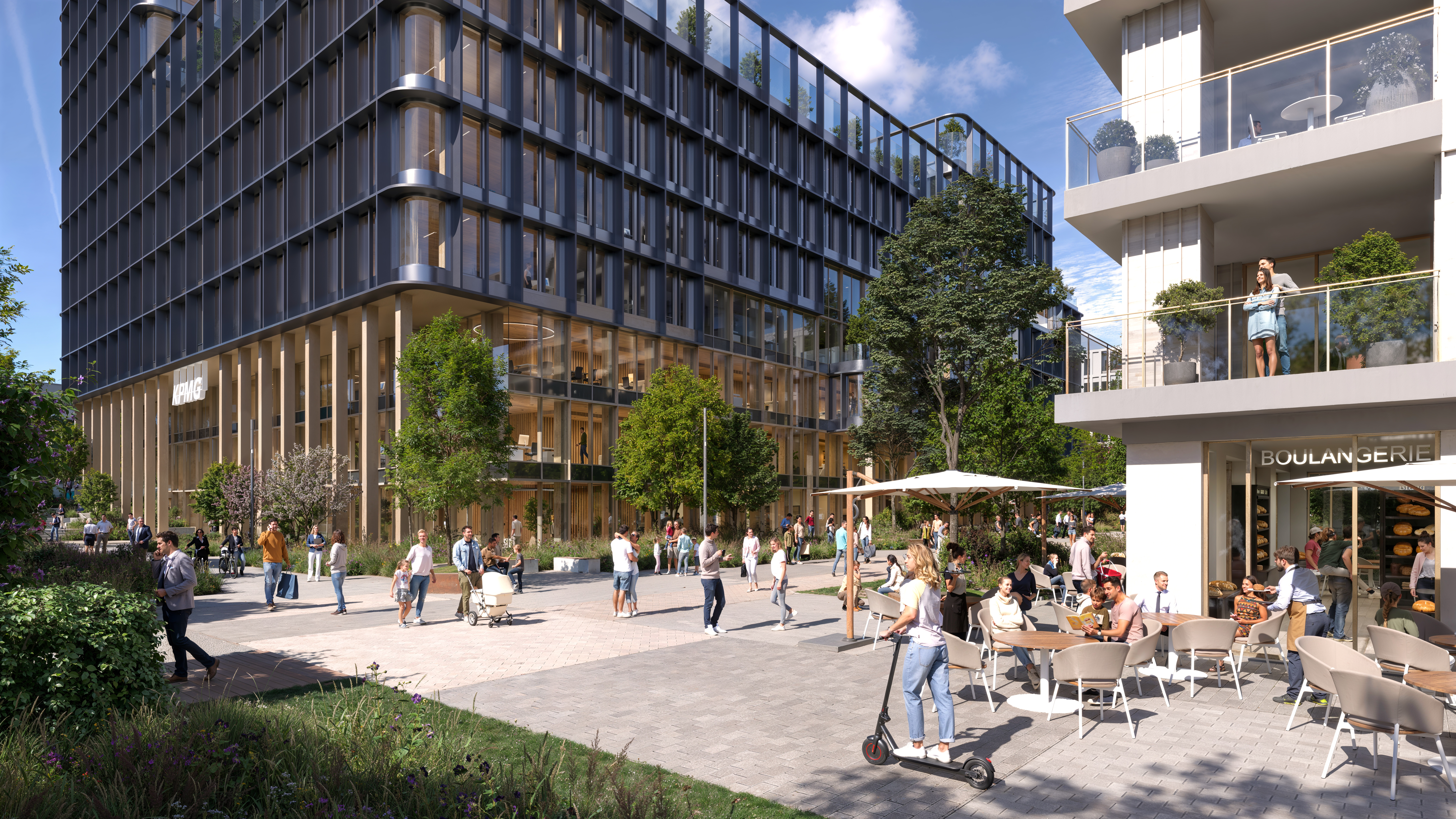 - Het team A2M (België) en Moreno Architecture & Associés (Luxemburg) staat in voor de drie kantoorgebouwen langs de JFK-laan, waaronder de toekomstige hoofdkantoren van KPMG Luxembourg en Linklaters, evenals het gebouw Ginkgo. Zij ontwerpen ook de centrale plaza en het paviljoen dat toegang geeft tot een nieuw recreatiecentrum, uniek in Luxemburg, evenals tot retail en diensten.